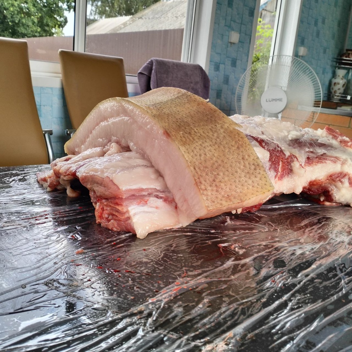 Вся прелесть сельской местности для меня в том, что можно купить уникальные продукты, например часть тушки свиньи выращенной в частном хозяйстве на молоке. Молоко из этого хозяйства я беру регулярно и мне оно очень нравится. И вот уже передняя четверть вьетнамки лежит у меня на столе. В помощь острые ножи и киллограммы соли. От спины к брюшине срезаю шматы по 10...15 см, режу их на квадраты и обмакиваю в крупную поваренную соль каждой стороной. Каждый кусок идёт в отдельный полиэтиленовый пакет. Сало просаливаю в холодильнике 3...5 дней. Затем после просаливания в холодильнике, не вынимая куски из пакетов складываю по 3...4 штуки в один вакуумный пакет, вакуумирую и отправляю на хранение в морозилку. Достанешь дома кусочек, оскребешь от лишней соли, порежешь на ломтики, положишь на чёрный хлеб и в рот) м-м-м-!!!