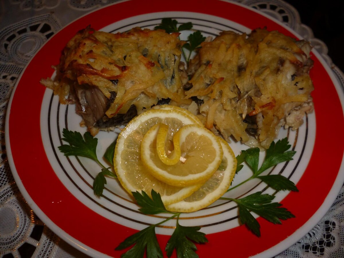 Ингредиенты: минтай-1000 г;картофель-2 шт.; лук репчатый-2 небольшие головки; сметана-2 столовые ложки; яйцо-1 шт.;горчица ( готовая)-1 чайная ложка; соль, специи- по вкусу; лимон-1/2 шт.; растительное масло. Рыбу моем. удаляем плавники, внутренности,темную пленку, покрывающую брюшину Режем на куски, слегка солим и оставляем для впитывания соли. Лук и картофель чистим Трем на крупной терке. Добавляем к ним специи,горчицу, сметану, солим, вбиваем яйцо Все хорошо перемешиваем. Куски рыбы обмазываем смесью и выкладываем на противень, смазанный растительным маслом. Запекаем в духовке при 220-240 градусах 30-35 мин. Все зависит от вашей духовки. Готовую рыбу сбрызнем соком лимона. Приятного аппетита