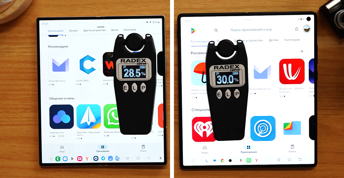 Ведущий YouTube-канала Premikum подробно протестировал смартфоны Samsung Galaxy Z Fold 6 и Vivo X Fold 3 Pro в съёмке фото, видео, производительности, автономности, работе с текстом, сравнил по уровню ШИМа. На Samsung Galaxy Z Fold 6 установлены две фронтальные камеры: на 10 МП снаружи (на которую и велась съёмка) и на 4 МП внутри. У Vivo X Fold 3 Pro их тоже две: обе на 32 МП. У Samsung при этом видео записывать можно в 4К 60 к/с, у Vivo — в 1080p 30 к/с. Естественно, во всём лучше оказывается Galaxy Z Fold 6. В том числе в портретном режиме и по стабилизации. У Samsung основной блок камер состоит из серхширика на 12 МП, основной камеры на 50 МП, телевика на 10 МП. У Vivo основной объектив и сверхширик имеют 50 МП, телевик — 64 МП. При съёмке самого себя на сверхширокоугольную камеру лучше отрабатывает Samsung. У него лучше качество изображения, детализация, стабилизация. Съёмка видео в 8К 30 к/с доступна с обоих смартфонов. По качеству всё примерно одинаково, у Samsung гораздо лучше