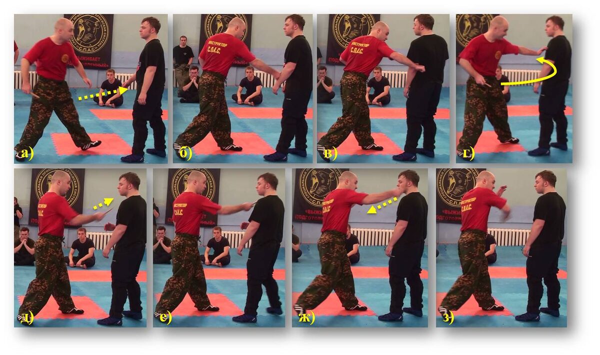 3. Если сцепление с землей, а также общее запаздывание действий не позволили шагнуть назад, а удар уже нанесен, отклонение корпуса и сбив по вооруженной конечности может помочь в опасной ситуации рис. г.