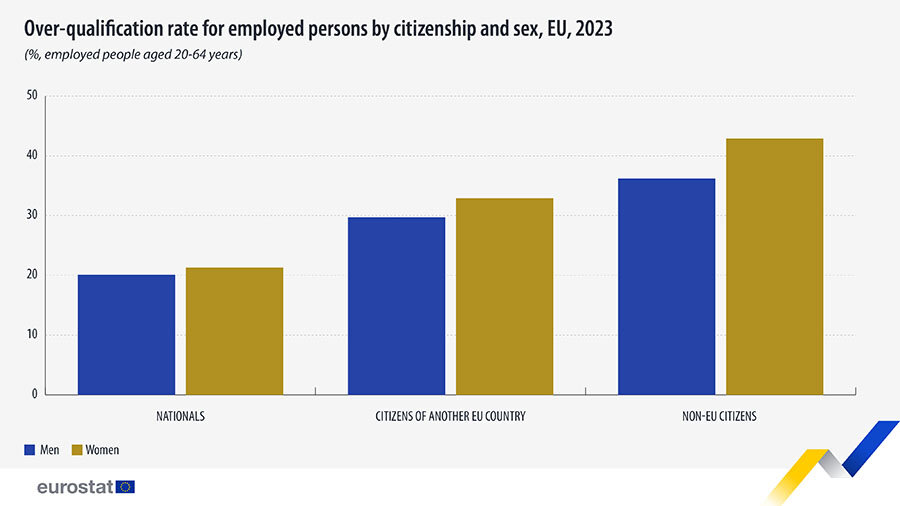 Коэффициент переквалификации мигрантов, приезжающих в Евросоюз из третьих стран, достигает 39,4%, по данным Eurostat. В исследовании учитывались работающие мигранты с высшим образованием. Зачастую они вынуждены заниматься трудовой деятельностью с низкой или средней квалификацией. Вероятность понижения их статуса оказалась в два раза выше, чем у других иностранцев.