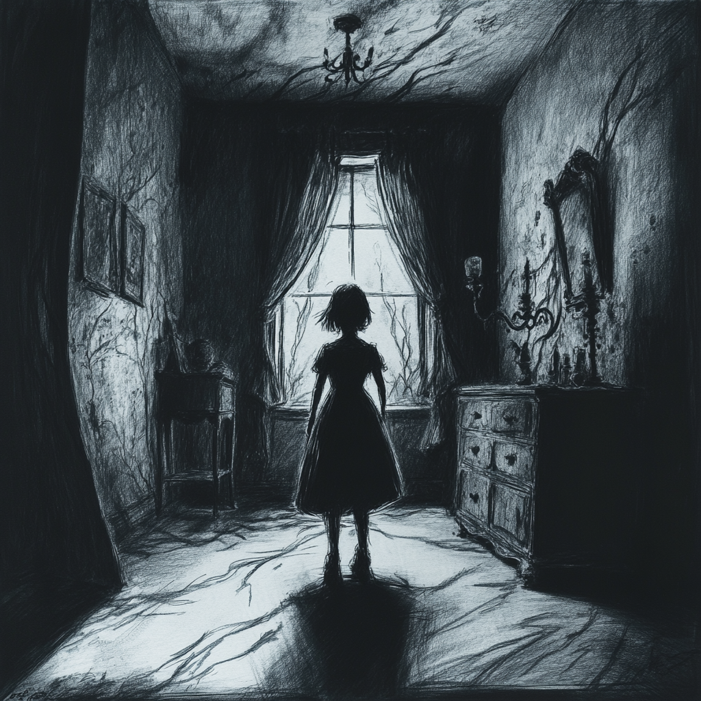 Мия была тихим и задумчивым ребёнком, с огромными глазами, в которых отражались мрачные тайны её маленького мира. Дни её проходили в бесцельных скитаниях по пустым, холодным комнатам, где она слушала, как скрипит пол под её ногами, словно шёпот давно ушедших душ. Её мать, измождённая болезнью, редко покидала постель, а отец был похож на тень, скользящую по дому в вечном поиске чего-то недосягаемого, его присутствие казалось призрачным и неуловимым. Жизнь Мии была подобна вязкому, удушающему кошмару, который медленно, но неуклонно тянул её в бездну.