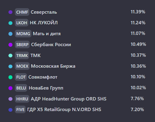 Портфель собран в первых числах апреля на 298 тыс. рублей. Куплены акции были изначально равными долями. За это время динамика стратегии: 🔼 Выше Индекса Мосбиржи на 1.45% 🔽 Ниже Индекса полной доходности на 2.29% Было желание совместить в этой стратегии: рост котировок + дивиденды, именно поэтому в портфеле не только надежные дивидендные истории, но и акции роста. Посмотрим, как он себя покажет на длинной дистанции. ⚡️Топ 10 Дивидендных компаний: - Лукойл $LKOH - ТМК $TRMK - Сбер $SBER - Мосбиржа $MOEX - Северсталь $CHMF - HeadHunter $HHRU - Мать и Дитя $MDMG - Novabev Group $BELU - Совкомфлот $FLOT - X5 RetailGroup $FIVE Не все компании объявили о выплате дивидендов у некоторых возникают проблемы в связи предстоящей редомициляцией. Дивидендная доходность портфеля на данный момент, составляет 8.3%. ✅️ Сделки в августе: ⭐️ Сбер Банк - 280Р + 20 акций = 5600Р ⭐️ Совкомфлот - 104.5Р + 40 акций = 4180Р ⭐️ Novabev Group - 4954Р + 2 акции = 9908Р ⭐️ Мосбиржа - 226.5