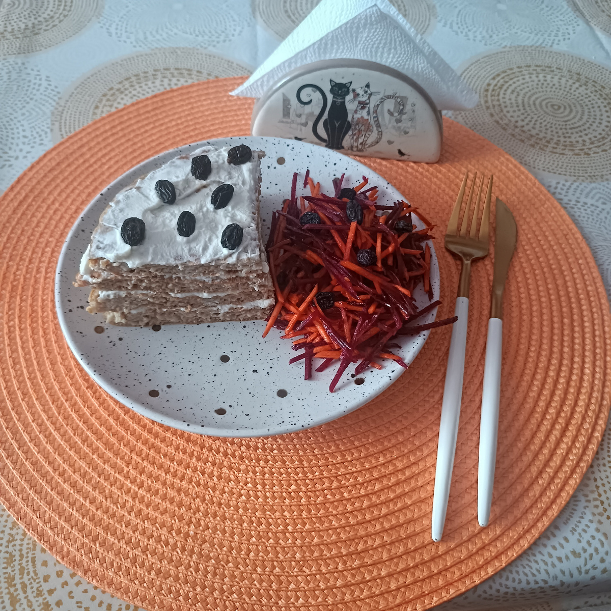 Добрый день! Я сегодня припозднилась ) А на завтрак готовила овсяноблин с яблоком и хочу с вами поделиться. Потому что результатом я осталась довольна. В августе к кабачкам присоединяются яблоки и я начинаю их везде добавлять. Вот и овсяноблин стал яблочным ) Рецепт на 4 ст ложки БГмуки. С вечера смешала 4 ст.ложки овсяной муки 2 ст.ложки кефира 1 яйцо Утром добавила в тесто 1 небольшое яблоко, очищенное от кожуры и натёртое на крупной тёрке + 1 мерную ложечку подсластителя и щепотку соды. Можно добавить немного изюма и корицы в тесто. Выпечь блин с двух сторон под крышкой на маленьком огне по 5 минут. Немного остудить. Блин получается пышным и влажным. Диаметр сковороды 20см., кстати. Я смазала рикоттой и сложила тортиком . Завтрак дополнила салатом из сырых свеклы и моркови. Он замечательно подошёл, яблоко и изюминки в салате тоже будут хороши.
