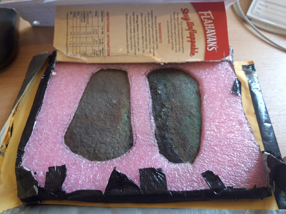 В июне 2024 года в отдел древностей Национального музея Ирландии пришла необычная посылка от неизвестного отправителя. Внутри картонной коробки из-под овсяного печенья, тщательно упакованные в пенополистирол, лежали два бронзовых топорика. Внутри посылки находилось короткое послание, в котором было сказано, что артефакты найдены случайно в районе Уэстмит с помощью металлоискателя. Отправитель посчитал их важной находкой и решил передать в музей. Эксперты музея определили, что это плоские топоры раннего бронзового века - редкая и действительно важная находка для Ирландии, которая может рассказать важную информацию о прошлом региона. Однако, чтобы артефакты "заговорили" нужно исследовать место обнаружения и понять причину, по которой топоры оказались в том месте. Так как никаких данных об отправителе не было, археологи решили предать случай огласке в прессе с просьбой откликнуться человека, который их нашёл. Следует отметить, что в этом случае нет какой-то ложной скромности. Это вполне