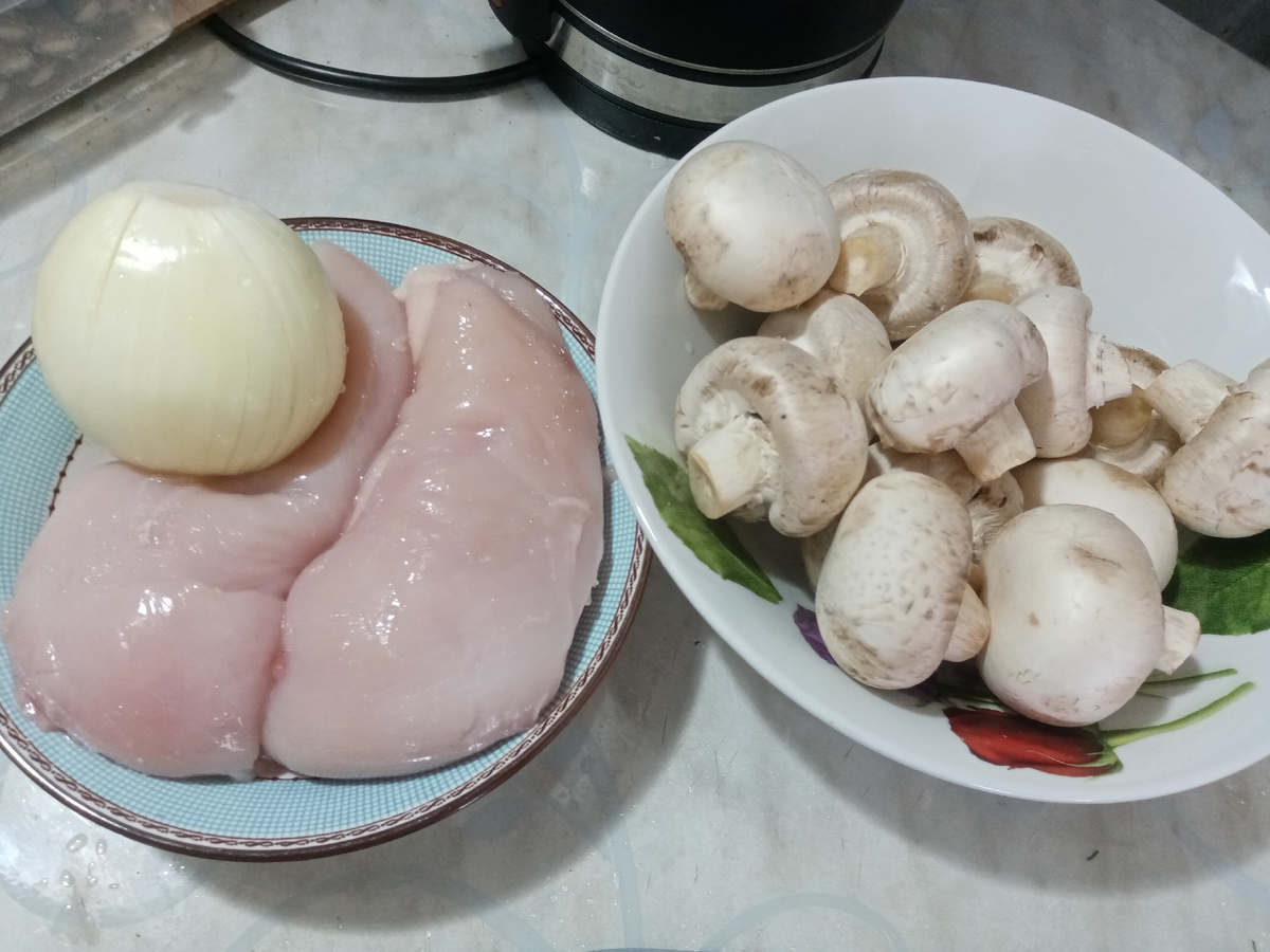 Это блюдо готовлю достаточно часто. Пару раз в месяц, зависит от наличия ингридиентов. Для приготовления понадобится Количество ингридиентов по желанию. Способ приготовления: Шампиньоны нарезать и обжарить. Куриную грудку и лук порезать. Сегодня я добавила паприку копченую и соевый соус, это по желанию, для маринада. А обычно брала приправу для курицы и сразу обжаривала. Затем обжаренные грибы и курицу с луком смешиваем в сковороде, пока они томятся на медленном огне, нужно смешать муку и молоко. Муки беру столовую ложку с бугорком, стакан молока. Эту смесь выливаю в сковороду, помешиваю, до загустения. Потом всё выкладываю на противень, посыпаю сыром. И в разогретую духовку, пока сыр не расплавится. Приятного аппетита!!!