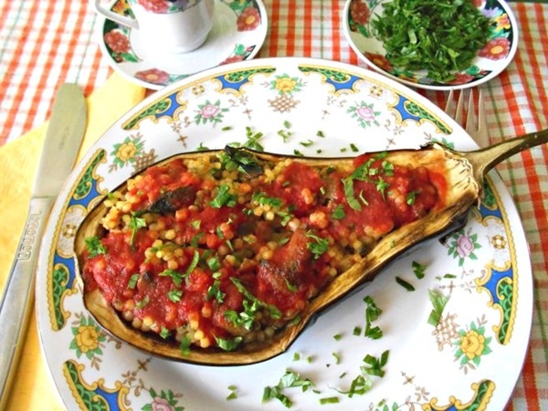 Фактически, я начинила один большой разрезанный пополам баклажан, который остался у меня от консервации, а также использовала в качестве начинки грибы, оставшиеся от тушёного мяса с грибами. Добавив ещё немного каши (у меня кус-кус, но можно любую крупу) и ещё пару ингредиентов, я приготовила вкусное постное блюдо для ужина на двоих.