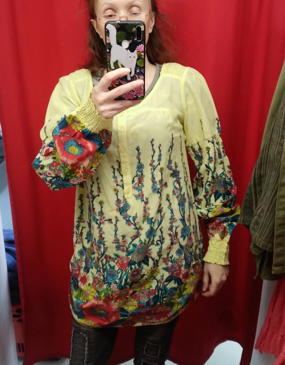 Здравствуйте. У нас опять акция "всё по 100 рублей", вроде месяц назад она была, но я не против. Хотя это превращается в мучение, народу много, ряды узкие. Несимпатичный дядька хотел прожечь меня взглядом, я ведь влезла в стройную мужскую непоколебимую фалангу у ряда мужских джинсов. Мне он ничего не сказал, я нацепила свои крохотный очечки на кончик носа и видимо было ясно, что я тут буду стоять до последнего. А вот женщине, тоже копающейся в мужских джинсах, съязвил, мол, что вы собираетесь их носить? Как будто нельзя выбирать джинсы для мужа, отца, брата и так далее. Я, например, сыну пару прикупила, чёрные из ткани помягче и прямой модели и темно-серые толстые, но узенькие слимы. За 100 рублей я сама кого хочешь прожгу взглядом🤣. К блузка и топикам почти не подходила, на вес они выйдут дешевле. Туника из тонкого хлопка, светло-желтый фон и цветочные заросли. По моему это крупные маки. Платье с запахом, без состава. Цвет красивый, но не вдохновила оно меня, да и горловина приходит
