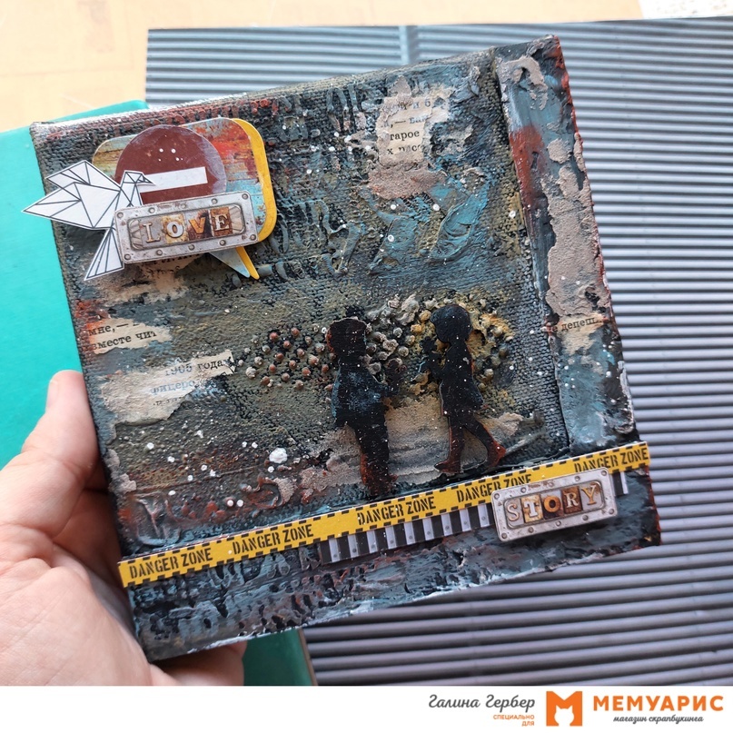 Для тех кто любит сочные подробности, чтобы закрепить видео-обзор. Вдохновение в каждой фотографии от нашего дизайнера. В студию! Всем привет! В эфире Галя! Сегодня я предлагаю вам проникнуться творчеством Бэнкси и создать холст-стену с элементами граффити. Для работы нам понадобятся следующие материалы: Процесс работы над холстом я засняла на видео, которое можно увидеть на нашем канале чуть ранее. Приглашаю к просмотру! А теперь можно и нужно разглядеть детали. Стена получилась словно настоящая, пошарпанная и очень фактурная. Текстуру создать помогли трафареты. Небольшую композицию из вырезалок и вырубки я приподняла с помощью переплётного картона. Также с помощью картона создала имитацию бордюра и выделила угол «здания». «АнтикБетон» на ощупь скорее засохший песок или штукатурка, чем бетон. Но в любом случае он потрясающе смотрится в работе! Кусочки бумаги с текстом я использовала для имитации оборванных объявлений. Чипборд я покрыла чёрным грунтом, края затонировала восковой пастой