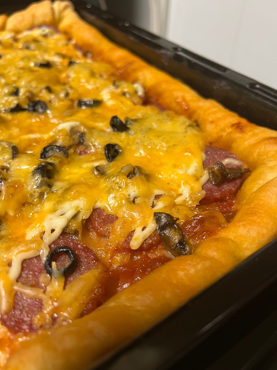 Муж у меня военный и на работе ему выдают продовольственный паек, который включает в себя большой набор продуктов. Нам приходится придумывать различные рецепты, чтобы использовать как можно больше продуктов из пайка. Решили поделиться рецептом нашей фирменной домашней пиццы, которая не оставила никого равнодушным. Она получается очень сочная и сытная, а в составе основная часть - это пайковые продукты. Из данного списка продуктов мы приобретаем только тесто, шампиньоны и майонез. В принципе, майонез можно сделать самим, да и тесто тоже. Но я ещё в поисках рецепта идеального теста для пиццы, поэтому покупаю готовое. Все остальные продукты у нас есть в пайке. 1) Подготавливаем все продукты: тесто полностью размораживаем, банки открываем, лук чистим. 2) Сковороду нагреть, добавить 1 ст.л. растительного масла. С шампиньонов слить воду и обжарить в сковороде до золотистого цвета. 3) Нарезаем лук соломкой, колбасу - кружочками. 4) Сыр натереть на крупной терке, оливки нарезать кружочками. 5)