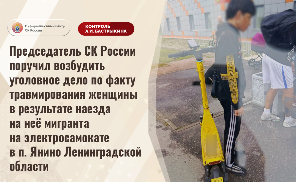 Председатель СК России поручил возбудить уголовное дело по факту травмирования женщины в результате наезда на неё мигранта на электросамокате в п. Янино Ленинградской области