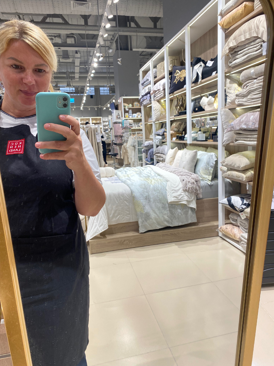 Я давно говорю мужу, что крутить пальцем у виска не очень правильно, на себе так то не показывают, а то палец свернешь или мозги раскрутишь, а они и так на соплях болтаются . Короче, скачала я недавеча приложение Ventra Go и каким то чудом схватила заказ на подработку в очень интересном магазине Kuchenland . Кому интересно что это вообще такое, вот ссылка 👇 А так как ставки на такие вакансии всегда повышены, я не долго думая, согласилась. Во первых потому, что устала от рыночных дол….ов, а во вторых, Инна согласилась открыть мой павильон и поторговать. Мне дали задачу- активно продавать. Ну я и продала столько, что им и не снилось 😃. Они там рты пооткрывали . Думали, что опять придет ни рыба ни мясо, а тут даже объяснять ничего не надо. Увидела покупателя, тут же выяснила потребность и сразу продала . Клад ! 🤣 Первые 15 минут я изучала информацию о товаре в компьютере. В этой подсобке мне выдали фирменный фартук Ну я и понесла красоту в мир Между прочим, получила настояще