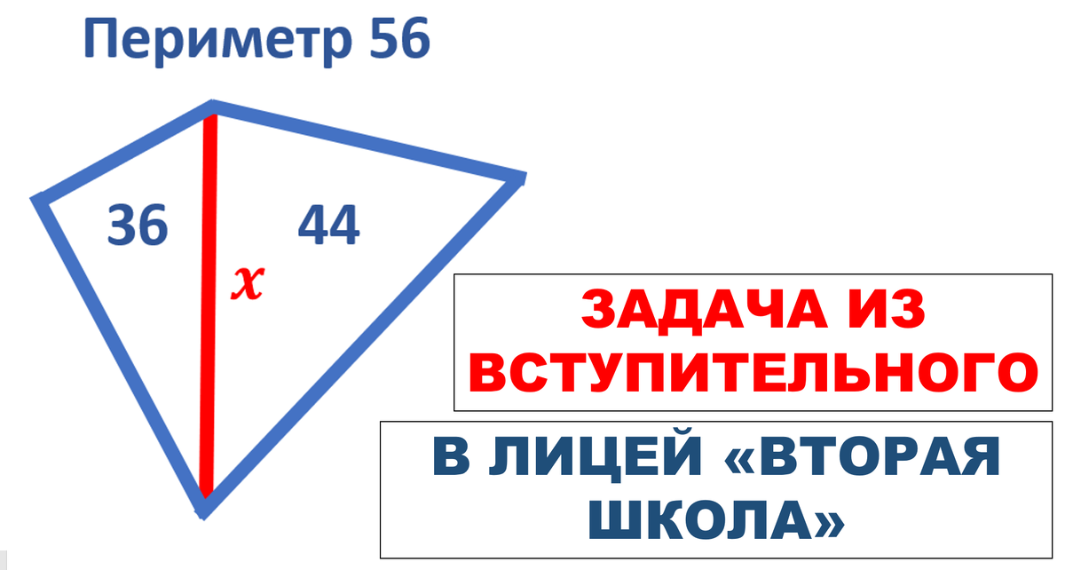 Лицей Вторая школа объявил о старте приёмной кампании 2025 года. Уже сейчас можно регистрироваться на вступительные испытания, а это значит, что пора, наконец, начать серьёзно и интенсивно к ним готовиться. Напоминаю, что делать это можно самостоятельно с помощью тренировочных вариантов с решениями на сайте https://cleverfox.info/, составленных по мотивам реальных экзаменов прошлых лет, или с репетитором, специализирующимся на подготовке школьников к поступлению в Л2Ш на сайте https://yourtutor.info/. Решим задачу из письменной части вступительного экзамена в 6 класс лицея "Вторая школа". В четырёхугольнике, периметр которого равен 56, провели диагональ. Она разделила его на два треугольника с периметрами 36 и 44. Найдите длину диагонали. Заметим, что если сложить периметры левого и правого треугольников, то получится периметр исходного четырёхугольника плюс два раза длина искомой диагонали: сначала со стороны левого треугольника, потом со стороны правого. Значит, 36 + 44 = 2x + 56, по