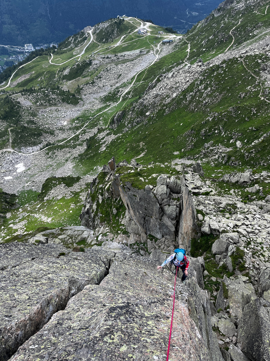 «Там так классно, хорошие шамонийские граниты, правда немного зализанные местами, поскольку маршруту 75 лет и много народу тут прошлось. Красивое лазание - бабочки в животе» - зазывал меня туда Володя. Если скрестить пальцы двух рук получается такой «ёжик». Не знаю, кому пришло в голову, что торчащие таким ершом скалы на бесконечно длинном гребне горы - это похоже на бабочку.