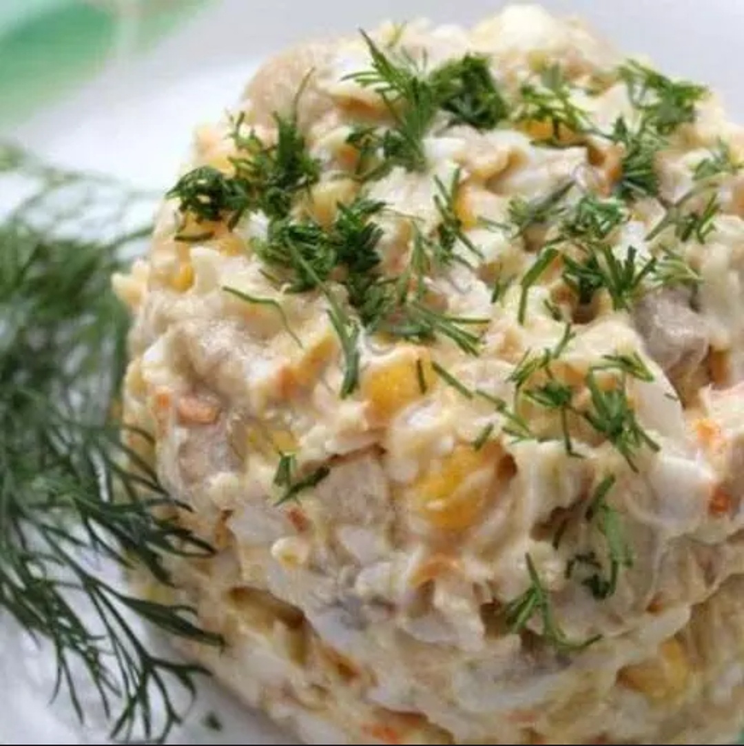 Ингредиенты: 0,5 кг. шампиньонов 1 большая луковица 1 куриное бедро 2 свежих огурца 2 яйца 1 банка маринованной кукурузы майонез – по вкусу соль, перец – по вкусу растительное масло для жаренья Приготовление: 1. Шампиньоны почистить, нарезать, немножко посолить и жарить на небольшом огне. 2. Перед тем, как в сковородку налить масло, нужно грибы немножко протушить под закрытой крышкой и вылить жидкость, которая образовалась. Луковицу почистить, нарезать и жарить до золотистого цвета. 3. Нарезать кубиками куриное мясо, яйца и огурцы. Положить все ингредиенты в салатник, добавить кукурузку и все тщательно вымешать. 4. Посолить, поперчить, заправить майонезом и еще раз вымешать Приятного аппетита