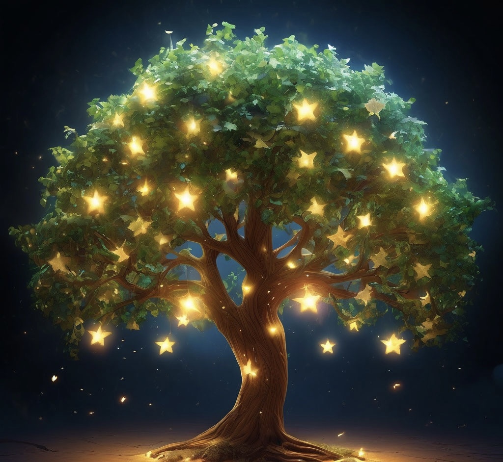 **Сказка о Звёздном Дереве** *В далекой стране, где небо всегда было усыпанным звездами, стояло волшебное дерево. Его листья светились мягким светом, а плоды были похожи на маленькие звезды. Это дерево звали Звёздным Деревом, и оно исполняло желания тех, кто был чист сердцем.* **Глава 1: Путешествие к Дереву** В маленькой деревне жил мальчик по имени Лёша. Он мечтал о приключениях и часто смотрел на звезды, представляя, как однажды отправится в далёкие края. Однажды ночью ему приснился сон о Звёздном Дереве, которое исполняло желания. Наутро он решил: «Я должен найти это дерево!» Лёша собрал немного еды и отправился в путь. Он шёл через леса, поля и горы, встречая добрых животных и мудрых старцев, которые рассказывали ему о своих мечтах и желаниях. **Глава 2: Испытания на пути** На своём пути Лёша столкнулся с тремя испытаниями. Первое испытание — это было озеро, полное мрачных теней. Лёша вспомнил слова старца: «Свет всегда побеждает тьму». Он собрался с духом и начал петь песню