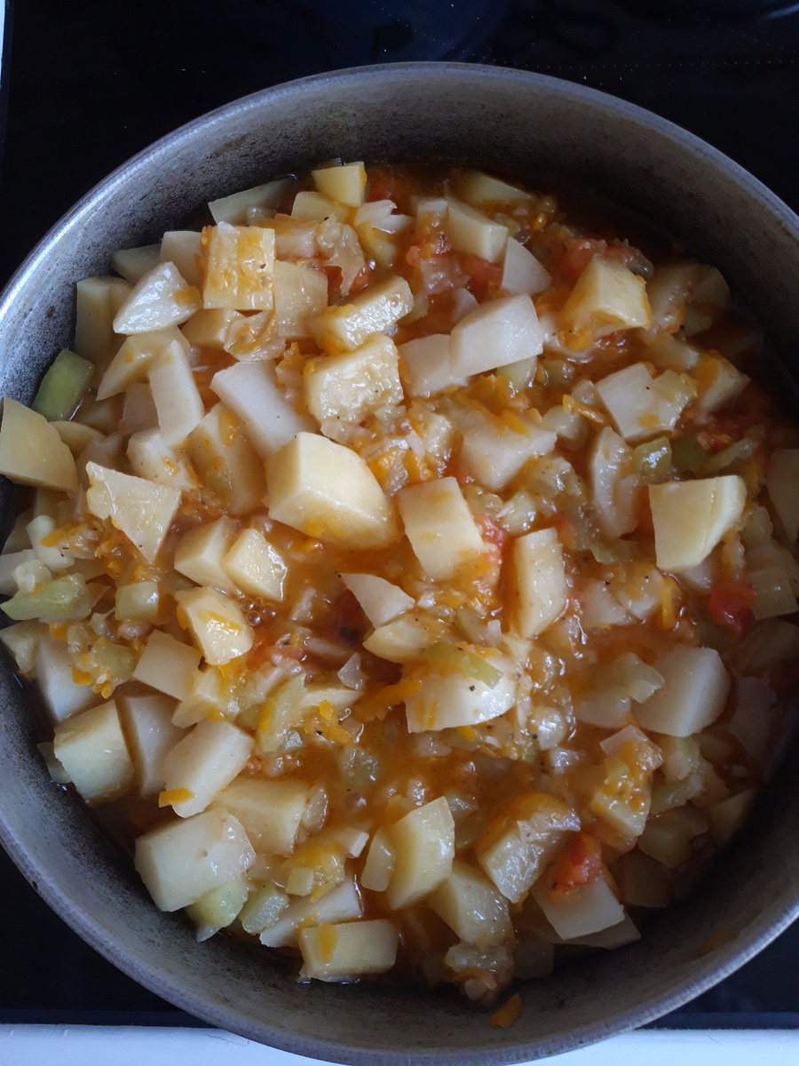 1 кабачок средний 3 помидорки 7 картофелен 2 морковки 1 луковица 3 ст ложки подсолнечного масла для жарки Все мелким кубиком порезать и на сковородку тушит. Посолить и поперчить.