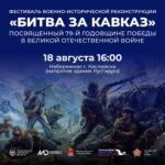 18 августа в городе Каспийск состоится масштабный фестиваль военно-исторической реконструкции «Битва за Кавказ», посвященный 79‑й годовщине Победы в Великой Отечественной войне. Организованно мероприятие Министерством по делам молодежи Республики Дагестан, Администрацией ГО «город Каспийск», Поисковым движением России, «Бессмертным полком России» и Каспийской флотилией. Программа фестиваля включает себя просмотр реконструкцию эпизода начала наступательной операции боевых действий, охватывающей период с 1942 по 1943 годы. Кроме того, будут использована макеты оружия и экипировка времен ВОВ, а также будет представлена выставка экспонатов времен Великой Отечественной войны, национальные подворья, полевая кухня, выставка современного оружия и флешмоб – разворачивание масштабной копии Знамени Победы. Телеканал SREDA | Написать нам
