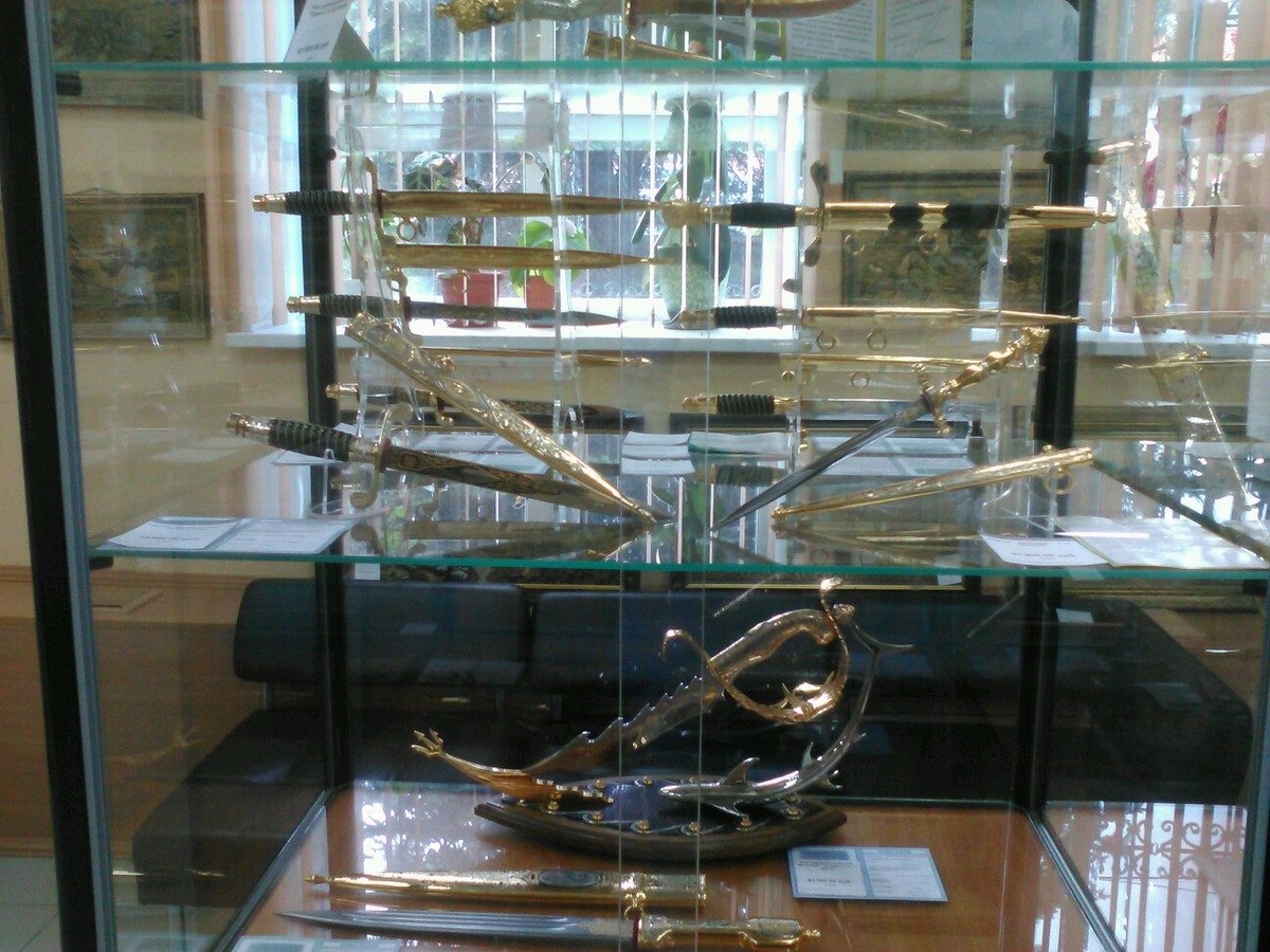 Сегодня я уехала домой. Приболела, и похолодало, у меня одежды нет на 14 гр. Приехал за мной муж Заехали в магазин оружейный в г. Златоуст. Златоуст вообще славится оружейный мастерством. Фото просто посмотрите. Всё продаётся. Дорого..... Некоторые изделия из золота сделаны или рисунок, а клинок из булатной стали.
