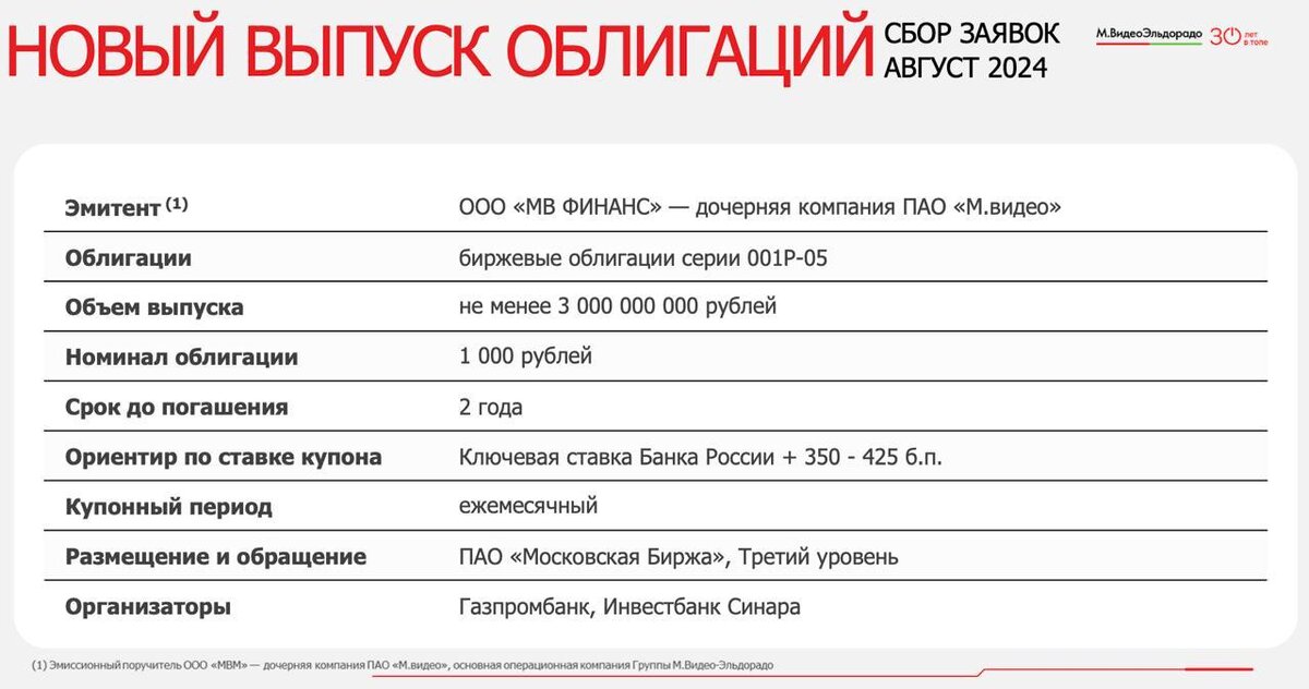 Мы с вами ранее неоднократно разбирали результаты компании, выделяя устойчивую бизнес модель Группы. Это позволило мне осуществить ряд точечных покупок облигаций М.Видео, и сегодня я решил еще раз вернуться к этой идее, по пути разобрав новый облигационный выпуск. Но начать я хотел с новости о полном погашении 07 августа облигаций МВ ФИНАНС 001Р-02 на 9 млрд рублей. Их то я как раз и набирал себе в портфель. М.Видео осуществила все выплаты за счёт положительного операционного потока и не привлекала заёмные денежные средства. С операционным потоком у компании все в порядке. В первом квартале М.Видео показала двузначный рост GMV. При этом онлайн продажи достигли 98 млрд рублей или 75% всего GMV. А что самое главное, показатель NetDebt/EBITDA на конец квартала оказался гораздо ниже, чем годом ранее. Компания ожидает его дальнейшего снижения к концу 2024 года. Именно это позволяет уверенно удерживать облигации эмитента. 💬Рейтинговые агентства также отмечают финансовую стабильность гру