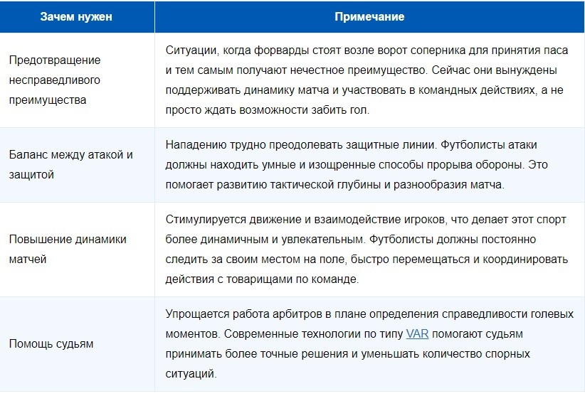 Офсайд был придуман и эволюционировал с целью поддержания баланса между атакующими и защищающимися командами, увеличения зрелищности игры и уменьшения количества спорных ситуаций. Современные изменения по типу внедрения системы VAR продолжают совершенствовать это правило, делая его более понятным и справедливым. Подробнее — в таблице.