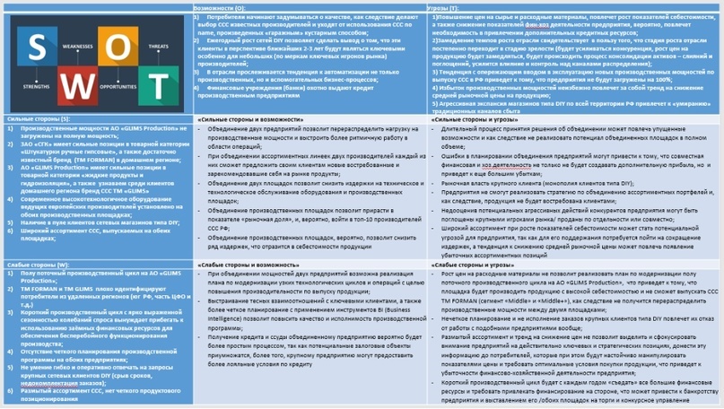 – Слабые стороны и Возможности в этом блоке вырисовываются основные направления для улучшений внутри компании, а также какие перспективы рынка можно использовать, чтобы устранить бизнес-слабости.