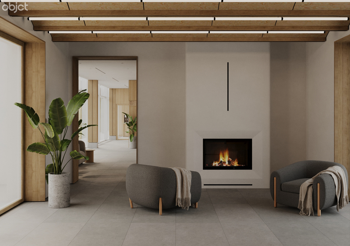 В проекте дизайна компании "Агро-Продукт" мы разработали концепцию, вдохновленную идеей семьи, включающей отца и двух сыновей. Эта концепция была воплощена в архитектурных решениях через два крыла здания, объединенных центральной входной группой. Основным элементом стал камин, который символизирует и является функциональным сердцем помещения. Камин привлекает внимание и создает атмосферу уюта и тепла, особенно важную для рабочего пространства. При разработке дизайна интерьера наша задача была обеспечить уют и комфорт для сотрудников, поэтому мы использовали натуральные и спокойные цветовые сочетания. В проекте преобладают оттенки терракоты, охры, зелени и оливковых цветов, создающие гармоничную и дружелюбную атмосферу. Эти цвета были выбраны осознанно, чтобы напоминать о природе и исторических корнях компании, способствуя созданию подходящей рабочей обстановки. Левое и правое крыло здания имеют свои уникальные особенности: в левом крыле преобладают белые стены и шпонированные панели,