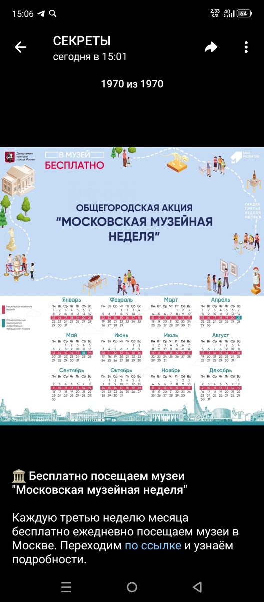 Уже ни день, ни два и даже далеко не месяц проходит акция "Московская музейная неделя". Каждую третью неделю месяца можно ежедневно ходить бесплатно в разные музеи Москвы! Оформите бесплатный электронный билет! Посмотрите, в какой день недели, в каком музее вход бесплатный. Ещё раз скину календарь, чтобы вы обратили внимание, что в этом месяце (августе) неделя началась сегодня! Эх, жаль я сейчас не в Москве...