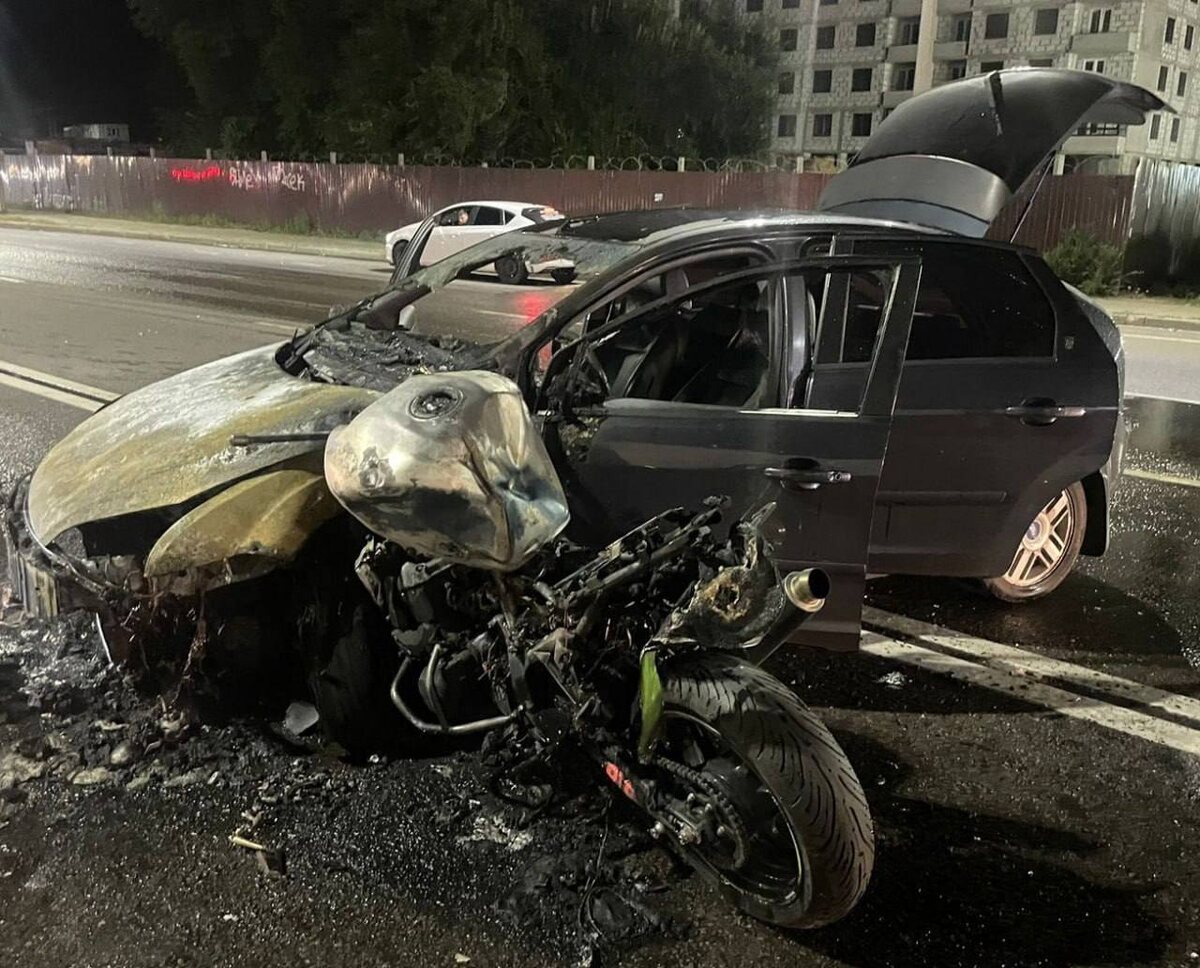 В Воронеже мотоцикл врезался в легковушку: оба ТС вспыхнули, водитель в больнице