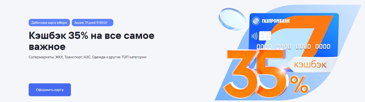 Скидка 35% на оплату ЖКХ, АЗС, Супермаркетов от Газпромбанка
