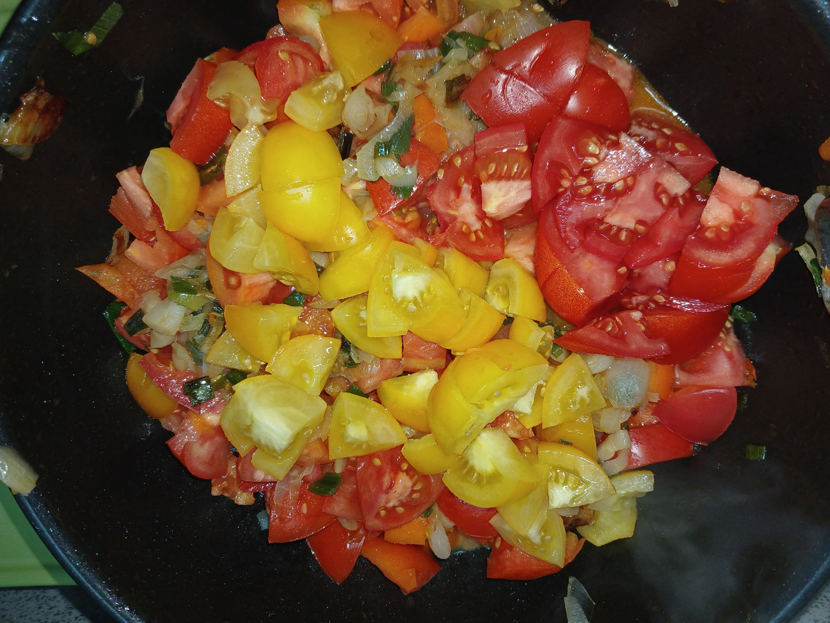 Август у садовода самый благодатный месяц. Это время активных заготовок и подведения результатов своих трудов. В августе уже понятно, что уродилось, а что нет. Но это и время головной боли, когда некуда деть излишки некоторых фруктов или овощей. Я уже писала статью с идеями куда деть избыток урожая, но сегодня хочу предложить вам полезное блюдо, в которое можно бухнуть пару килограмм помидор (или некондицию), много зелени и лука. Я делаю его так: Обжариваю лук (репку и зеленый), потом кладу много крупно нарезанных помидор Как только масса закипела, добавляю зелень Перемешиваю, солю, перчу, могу добавить ложку сахара (если помидоры недозрелые). И сразу вливаю сверху яйца. Не тушите отдельно долго помидоры, потому что яйца в этой массе готовятся минут 10 и помидоры дойдут. Когда белок побелел, можно снимать с огня. Макаем лаваш в яйцо, подхватываем помидорную массу и отправляем в рот. Получаем массу ярких впечатлений, полезный завтрак/обед/ужин и самоудовлетворение от применения лиш