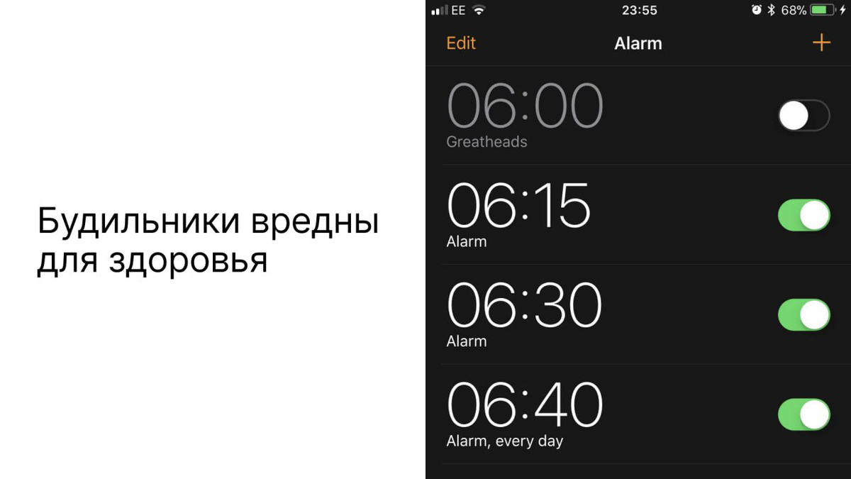 Каждый будильник для организма — стресс, а некоторые испытывают его многократно каждое утро. Из-за постоянных пробуждений нарушается цикл сна, что приводит к усталости, перепаду настроения и тревожности.