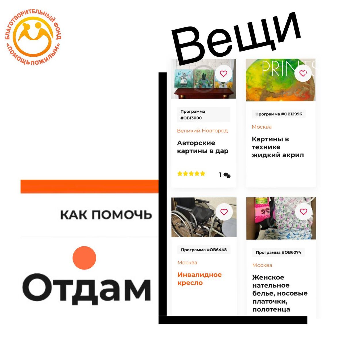🌟 Знаете, что делает мир ярче и добрее? Добрые дела! Именно это мы делаем вместе с вами на нашем сайте благотворительного Фонда "Помощь пожилым" . Давайте помогать тем, кто в этом нуждается, ведь вместе мы можем сделать больше! В разделе "Отдам вещи" на нашем сайте https://fond60.ru/exchange/ собраны вещи и товары, которые наши добрые благотворители пожертвовали для пожилых людей. Новая одежда, обувь, средства реабилитации в хорошем состоянии, картины, наборы для творчества, медикаменты - все это доступно для нуждающихся! 👵👴 Если вы старше 60 лет и нуждаетесь в помощи, в получении товаров из этого раздела, не стесняйтесь обращаться к нам. Оставьте заявку в личном кабинете на сайте или напишите нам на почту: info@fond60.ru. Мы всегда рады прийти на помощь и поддержать вас в трудную минуту. Наша команда с удовольствием поможет вам подобрать необходимые вещи, товары и передаст их вам абсолютно бесплатно. Присоединяйтесь к нашему благотворительному Фонду и помогайте тем, кто в этом ну