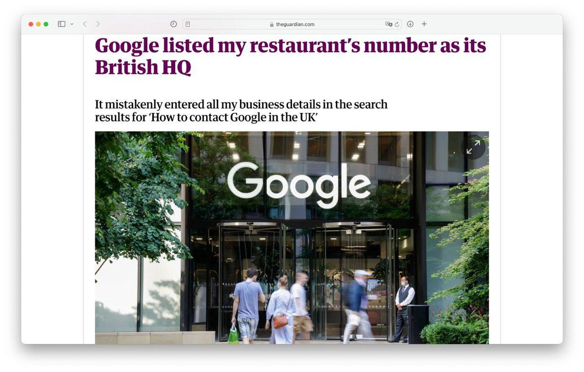 Компания по ошибке прикрепила номер телефона и адрес его заведения к результатам поиска по запросу «Как связаться с Google в Великобритании».
