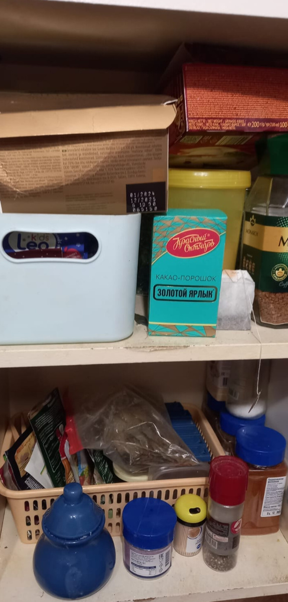 На верхней полке в белом контейнере всё для выпечки: дрожжи, разрыхлитель, ванилин, крахмалы, сахарная пудра, красители, сода... В голубом контейнере, он спрятался за банками, напитки: кофе, чай, какао, кисель в брикетах.