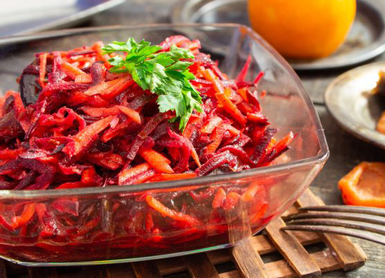 Этот пряный и ароматный салат из свеклы и моркови с пикантными приправами вы можете есть большими порциями, не беспокоясь за свою фигуру, утверждает Евгения Калмыкова из Черкесска, которая прислала нам этот рецепт. Ингредиенты: 200 г свеклы, 200 г моркови, 4 финика, 4 кураги, половинка лимона, 1 ст. л. меда, 1 ч. л. аджики из зеленого перца чили, 0,5 ч. л. молотой корицы, 1 ч. л. тмина, 1/4 небольшого мускатного ореха, 2 ст. л. оливкового или растительного масла, морская соль по вкусу. Сырую свеклу моем, очищаем от кожуры, натираем на крупной овощной терке. Тертую свеклу заливаем холодной кипяченой водой и оставляем на пару минут, чтобы смыть свекольный сок. Откидываем промытую свеклу на дуршлаг, чтобы вода стекла полностью. Из половины лимона выжимаем сок, процеживаем его, чтобы косточки не попали в салат. Смешиваем свеклу с лимонным соком. Морковь моем, чистим, натираем на крупной терке и добавляем ее в салат. Тщательно промываем финики и курагу, ошпариваем кипящей водой, нарезаем ме