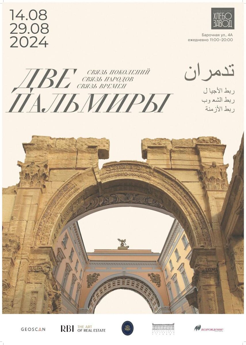 В Левашовском хлебозаводе (Петербург) пройдет выставка "Две Пальмиры: связь поколений, связь народов, связь времен". Концепция выставки - показать влияние античной архитектуры на архитектуру Петербурга. В экспозиции представлены ранее неопубликованные фотографии XIX века из Научного архива ИИМК РАН и напечатанные на 3D-принтере макеты храма Бэла и Триумфальной Арки – той самой, которую вся Россия знает по фотографии на обложке учебника истории Древнего мира за 5 класс. Дата проведения: 14 - 29 августа