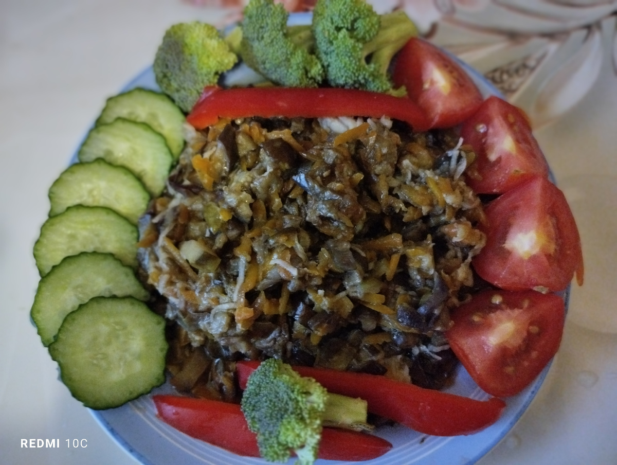 Дорогие друзья! Баклажаны растут, я их собираю, а что с ними делать? Вот я и тушу их каждый день на ужин в качестве гарнира к мясным блюдам. Конечно из баклажанов можно много разных блюд приготовить, но я чаще просто тушу. Что для этого нужно? Беру четыре баклажана, режу баклажаны на полоски, затем режу на кусочки. Баклажаны стараюсь срывать в неполной зрелости, чтобы у них не образовались семена и чтобы кожица баклажанов была мягкая. Ещё беру две небольшие моркови и два-три зубчика чеснока. Порезанные баклажаны высыпаю на сковороду с налитым подсолнечным маслом, добавляю тёртую морковь, перемешиваю и тушу 15-20 минут. А пока тушатся баклажаны, тру на мелкой тёрке чеснок. Затем добавляю тёртый чеснок в тушёные баклажаны и тушу ещё минут пять. Самое главное, не забыть посолить по вкусу. Всё, закуска из баклажанов готова! Очень вкусное блюдо, поверьте на слово! Украшаем дарами из сада по своему усмотрению. Приятного аппетита! Спасибо всем, кто дочитал до конца! Буду благодарна за