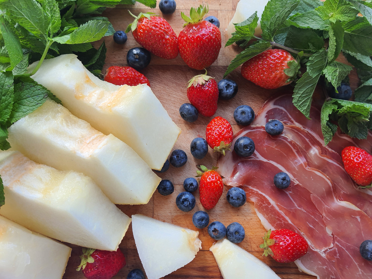 дыня, вяленое мясо (у меня прошутто) 1 упаковка, клубника, голубика, мята для украшения, сахарная пудра по желанию.