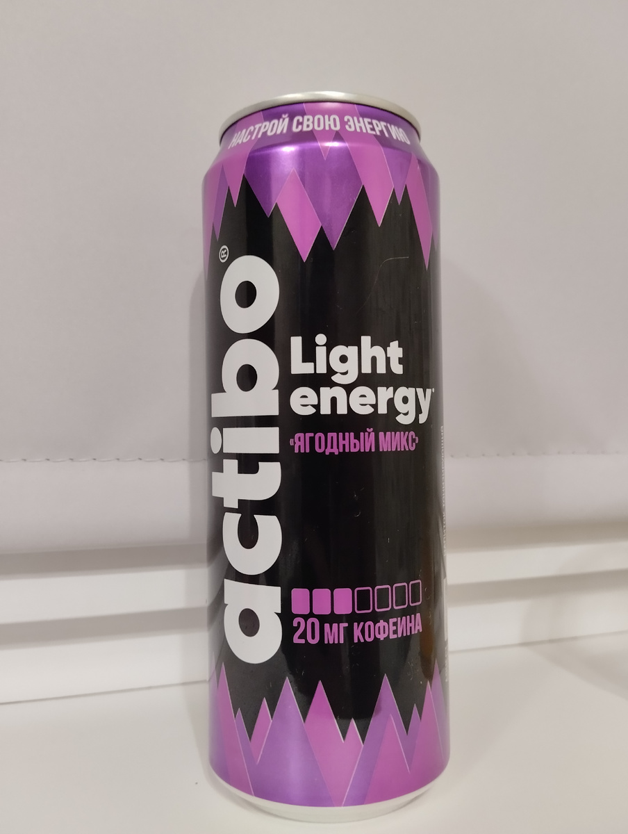 🎬Обзор🎬 actibo 🫐Ягодный микс🍓 Актибо не сильно распространены и популярны, но вкусные, так что жду неплохого ягодно вкуса, главное без химозы. Цена – 134₽ Куплен – Гипербола Объём – 450 мл ☕Кофеин☕ – 20/100 🧬Таурин🧬 –?/100 Сахар✔️ Подсластители✔️ Всё такой же невычурный дизайн, но при этом выглядит гламурно, из-за фиолетовых тонов. Все как обычно, остроконечные формы сверху и снизу, лого набок (что для меня всегда выглядит классно). И моя любимая часть – шкала кофеина и вкус в кавычках. Состав читаемый и относительно большими буквами. Непривычный ягодный запах, не как у всех других ягодных. В нём очень яркая ежевика и ещё какая-то ягода которая из-за ежевики менее различима. Похоже чем-то на йогурт. Запах очень классный и нестандартный за что плюс однозначно. Вкус тоже не как у всех, он без кислинки и в нём всё так же ощущается ежевика, но лишь вначале. После ощущается что-то похожее на малину, очень сладкую, а в конце будто её косточки. Подсластители размывают вкус под конец,