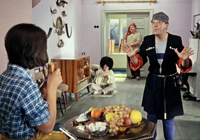 Что ела Варлей в «Кавказской пленнице» на самом деле. 🎞 А как же у нас текли слюнки во время просмотра этой сцены в «Кавказской пленнице». Тут и виноград, и персики, и сыр, и традиционная армянская выпечка гата. 🍑Но все было не так радужно. На самом деле почти все фрукты были искусственными восковыми муляжами. 🍇« В те годы, даже в летний сезон, не было такого изобилия всего, как сейчас. Поэтому сливы и персики были…консервированными, из компота, а среди воскового винограда лежала одна веточка настоящего, от которого я отщипывала ягоду за ягодой», — вспоминала Варлей. 🥐А армянскую сладость купили до съемок этой сцены, и она уже успела зачерстветь. Поэтому знайте: в этом кадре Варлей так аппетитно ест… очень черствое лакомство.