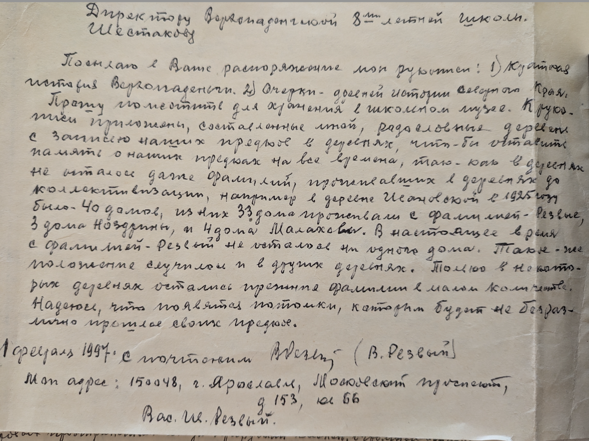 Рукописи не горят. Никогда бы не подумала, что меня это коснется персонально. Сейчас у меня в руках оказалась рукопись, в которой рассказывается о моих предках. Рукопись эту написал мой односельчанин Резвый Василий Иванович. Он передал рукопись моему отцу, который в то время был директором Верхопаденьгской 8-летней школы для хранения в школьном музее. И вот прошло всего лишь 25 с небольшим лет, и школы в Верхопаденьге уже нет, музея, соответственно, тоже нет. Нет и самого автора. А вот рукопись сохранилась и попала ко мне. И я решила опубликовать её в интернете, чтобы жители когда-то большой и многолюдной, а теперь умирающей деревни узнали свою историю. Возможно, нашли в ней имена своих предков и поняли, откуда они "есть пошли". Вот так смотрится первая страница рукописи. Расшифровка здесь: Директору Верхопаденьгской 8-летней школы