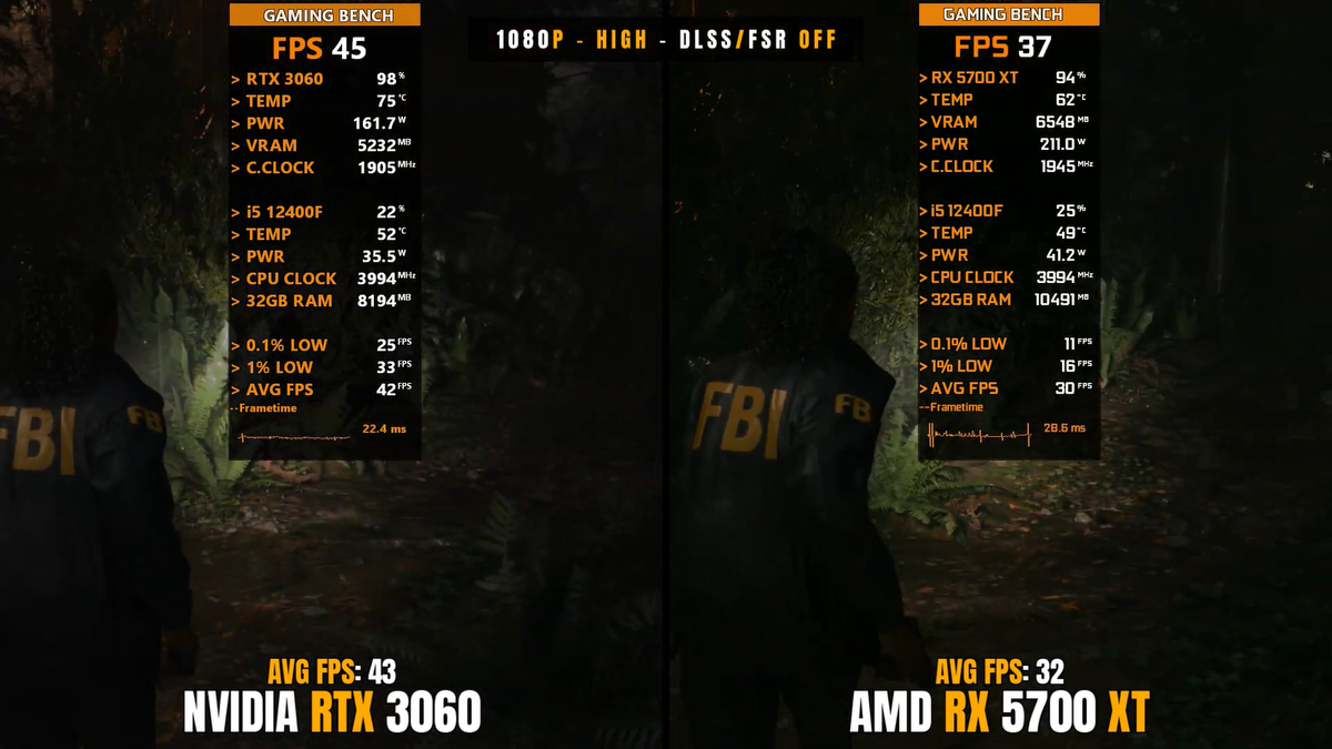 На YouTube-канале GAMING BENCH протестировали в современных играх в 1080p видеокарты RTX 3060 и RX 5700 XT. Alan Wake 2 шла с высоким пресетом, DLSS/FSR Off. В среднем в этой игре удалось получить 43 к/с (RTX 3060) и 32 к/с (RX 5700 XT). При этом RX 5700 XT была медленнее конкурента на почти 26%. С низким пресетом и DLSS/FSR Quality средний FPS составил 57 к/с и 40 к/с соответственно, а разница между ними была уже 30%. Игра The Last Of Us Part 1 Starfield тестировалась на низких настройках графики и без DLSS/FSR. Средняя частота кадров составляла в ней 74 к/с (RTX 3060) и 77 к/с (RX 5700 XT). Spider Man Remastered запускалась с графикой Very High, DLSS/SR Off. В среднем удалось получить в этом проекте 96 к/с (с RTX 3060) и 108 к/с (с RX 5700 XT). В игре Horizon Forbidden West с высокой графикой средняя частота кадров равнялась 48 к/с (RTX 3060) и 59 к/с (RX 5700 XT). С DLSS/FSR Quality результат составлял 60 и 68 к/с соответственно. A Plague Tale Requiem тестировалась с ультра-пресетом