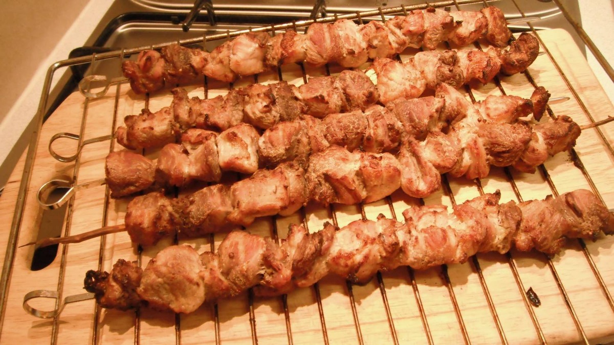 Основная проблема домашних шашлыков из духовки — они могут получиться пересушенными. Чтобы этого избежать, выбирайте мясо с тонкими прослойками жира, например, свиной ошеек. Готовьте шашлык в хорошо разогретой духовке при температуре 250 градусов, ближе к нагревательному элементу. Имитируйте приготовление на углях, переворачивая шампуры каждые 5–10 минут и следя, чтобы мясо не подгорело. Общее время приготовления составляет 20–25 минут. Используйте настоящие шампуры, а не деревянные шпажки. Ингредиенты: Приготовление: