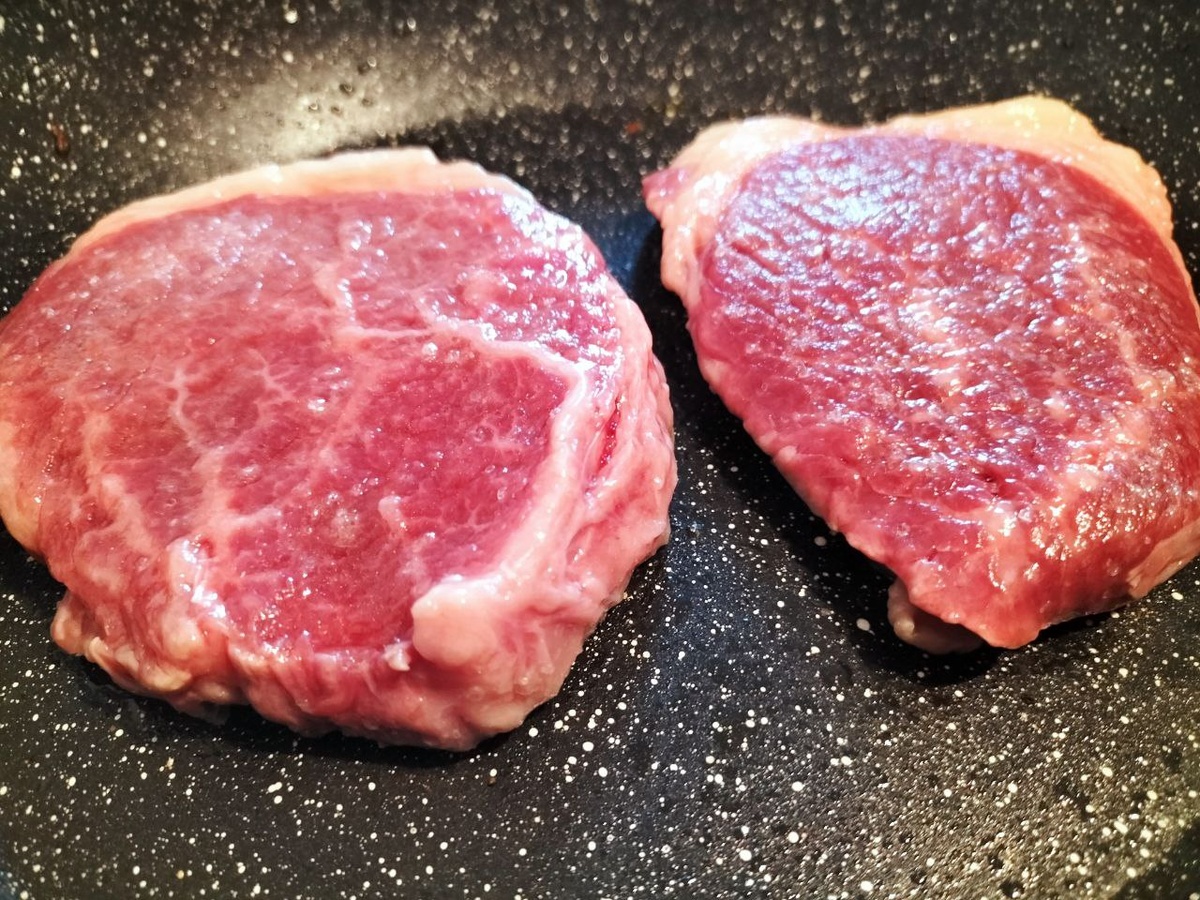 Если хотите быстро приготовить мясо, то это можно сделать за 15 минут. Поверьте, я не преувеличиваю. В этот раз готовила стейк из говядины на сковородке. Было куплено два кусочка мраморной говядины, которые и были сразу прожарены и съедены) Вся особенность в правильной жарке и как добавлять соль, специи. Пожалуй в первую очередь стоит упомянуть важные правила для приготовления стейка - 1) Мясо должно быть комнатной температуры. Заранее достаньте его из холодильника. 2) Не надо отбивать говядину, особенно мраморную и мариновать. Также нельзя сразу добавлять приправы и специи, потому что при жарке они начнут пригорать и могут дать специфический запах, что повлияет и на вкус мяса. Сухая сковородка с антипригарным покрытием разогревается хорошо. Стейки жарятся на сильном огне. Посолить можно сразу перед жаркой или после, это уже, как кому больше по вкусу. Как только сковорода разогрелась, мясо выкладывается - Жарить на сильном огне (нагреве) примерно 5-7 минут с одной стороны, потом точно