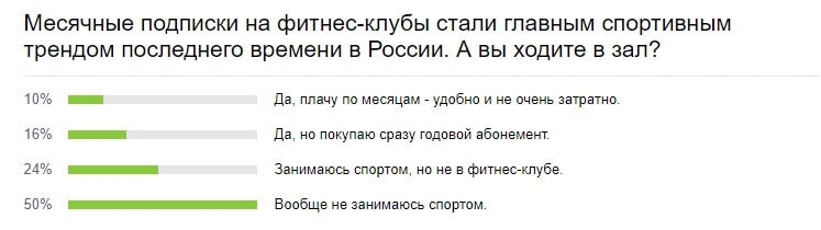 На DVHAB.ru проходил опрос, в котором мы поинтересовались у наших читателей, пользуются ли они услугами фитнес-клубов и покупают ли месячные карты или годовые абонементы в спортзалы. Абсолютное большинство, ровно 50% опрошенных, заявили, что вообще не занимаются спортом. Еще 24% не столь категоричны, спортом они занимаются, но услугами фитнес-клубов не пользуются. 16% не мелочатся, они берут абонемент сразу на год. И лишь 10% опрошенных приобретают клубную карту на месяц или три. Отметим, что на главной странице DVHAB.ru каждую неделю проводятся опросы на самые актуальные и острые темы. Найти вы их можете, пройдя по ссылке. Напомним, ранее на DVHAB.ru проходил опрос, в котором мы поинтересовались у наших читателей, следили ли они за Олимпийскими играми в Париже.