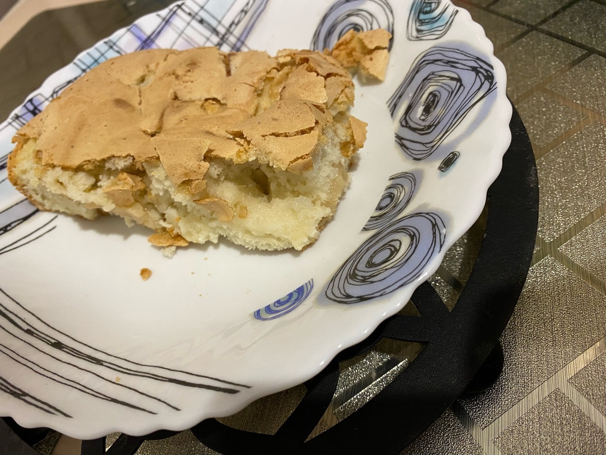 Требуемые ингридиенты: Мука - 1 стакан Сахар - 1 стакан Яблоко- 2 крупных или 3 средних или 4 мелких Яйцо - 4 штуки Разрыхлитель Ванильный сахар - 1 маленькая пачка Нарезаем яблоки кубиками. Желательно твердые и кислые. Сладкие будут не так контрастировать с тестом Смешиваем муку, сахар. разрыхлитель и ванильный сахар Использовал такой, согласно инструкции на обратной стороне(у меня вышло 5 гр) Добавляем яйца и взбиваем, желательно миксером для создания пузырьков в тесте Пришлось менять тару, так как было неудобно взбивать в прежней и некуда было бы добавлять яблоки Добавляем яблоки, смешиваем Выливаем в противень Вот такая красота вышла у нас. Приятного аппетита!