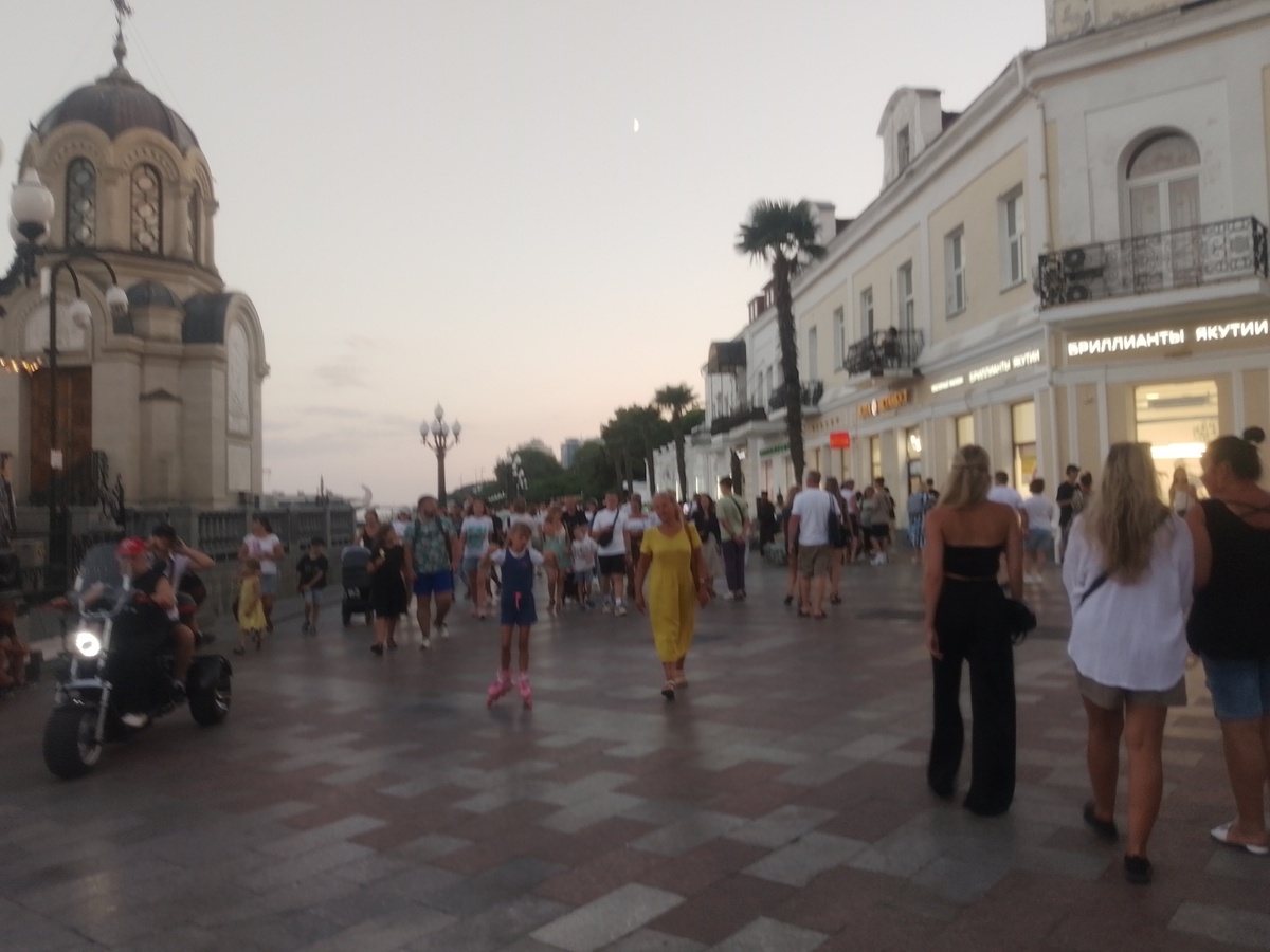 Здравствуйте! Приехали в Ялту, передохнули после дороги и экскурсии в мраморную пещеру, пошли посмотреть как обстановка на Ялтинской набережной. Людей много, оно и понятно последний месяц лета, это мы здесь, в Крыму еще увидим тепло и солнце, многим возвращаться на работу, в школу, в университет, в Сибирь, на север, на Урал, на Дальний восток, а кому то и в Якутию. Все не спеша гуляют, все места в кафе заняты, еле нашли свободный столик, накормить дочь зелеными чебуреками. Но официантка сказала готовить будут минут сорок, ждать не стали, ну значит в другой раз. Дочери говорю, ну как тебе Ялта, фонтаны, пальмы, бутики, тысяча лавок с сувенирами, большое количество кафе. Здорово говорит, все для того что бы туристы развлекались после трудного рабочего сезона.Но и ценник здесь, по сравнению с той же Феодосии, гораздо не скромный. Кто то номер в Приморском за тысячу в сутки сдает, а тут шезлонг столько стоит. А уж если тебе лимонад принесут, придется наверное кредит брать. На пляж