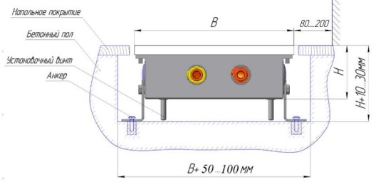 - Корпус конвектора должен быть установлен строго горизонтально в выполненной в полу нише, глубина и ширина которой зависит от высоты и ширины корпуса.