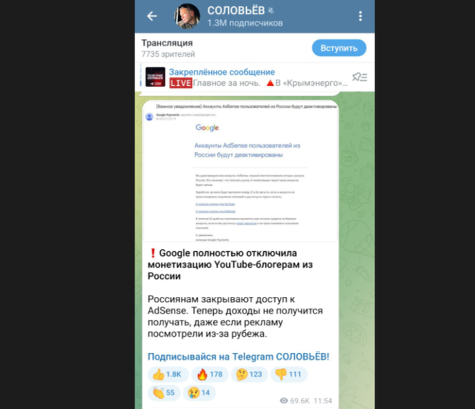 Я чуть не подавился утренним кофе, когда приятель прислал мне скриншот ТГ-канала нашего "Маршала пропаганды" Володи Соловьёва. Где он сокрушается на тему отключения монетизации "пророссийским блогерам". Вообще новость давно не новость и эти проблемы возникли практически сразу, ещё ы 2022. Причём коснувшись всех без исключения. Включая и тех, кто делал контент никак не связанный с политикой или специальной операцией. И хотя монетизация от просмотров на Ютюбе не такая уж существенная, многие тогда взгрустнули. Но! У Ютюба есть два преимущества. Первая - это сама аудитория, стало быть охваты. Вторая - прогнозируемость этих охватов. Имеющих связь и с качеством контента, и с популярностью автора (в том числе количеством подписчиков). Что позволяет делать рекламные интеграции, зарабатывая на этом. Если уж вопрос "заработков" столь существенный.